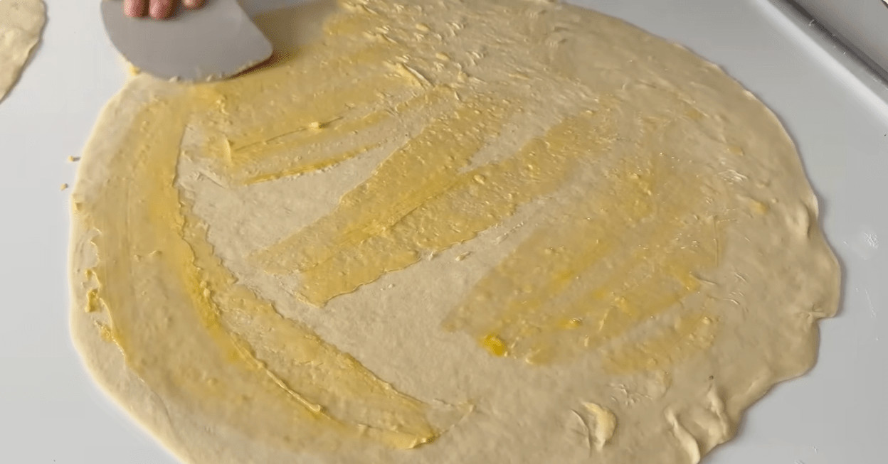 Gotovo tijesto podijelite na tri jednaka dijela i od svakog oblikujte glatku kuglu. Prekrijte ih kuhinjskom krpom ili prozirnom folijom i ostavite da odmore oko 10 minuta. Ovaj korak je ključan jer opušta gluten, čineći kasnije razvlačenje tijesta mnogo lakšim. Tijekom odmora, gluten se opušta, što rezultira mekšim tijestom koje će se lakše razvaljati. Nakon odmora, svaku kuglu razvaljajte u krug promjera otprilike 40–45 cm. Prvi krug stavite na radnu površinu i premažite ga mekanim puterom, a zatim na njega stavite drugi krug, i ponovo premažite puterom. Isto ponovite i sa trećim slojem. Ovaj postupak slaganja stvara slojeve koji će tokom pečenja postati nevjerojatno hrskavi i ukusni. Kada se kiflice ispeku, slojevi će se lijepo odvojiti, stvarajući savršen kontrast između mekanog i hrskavog.