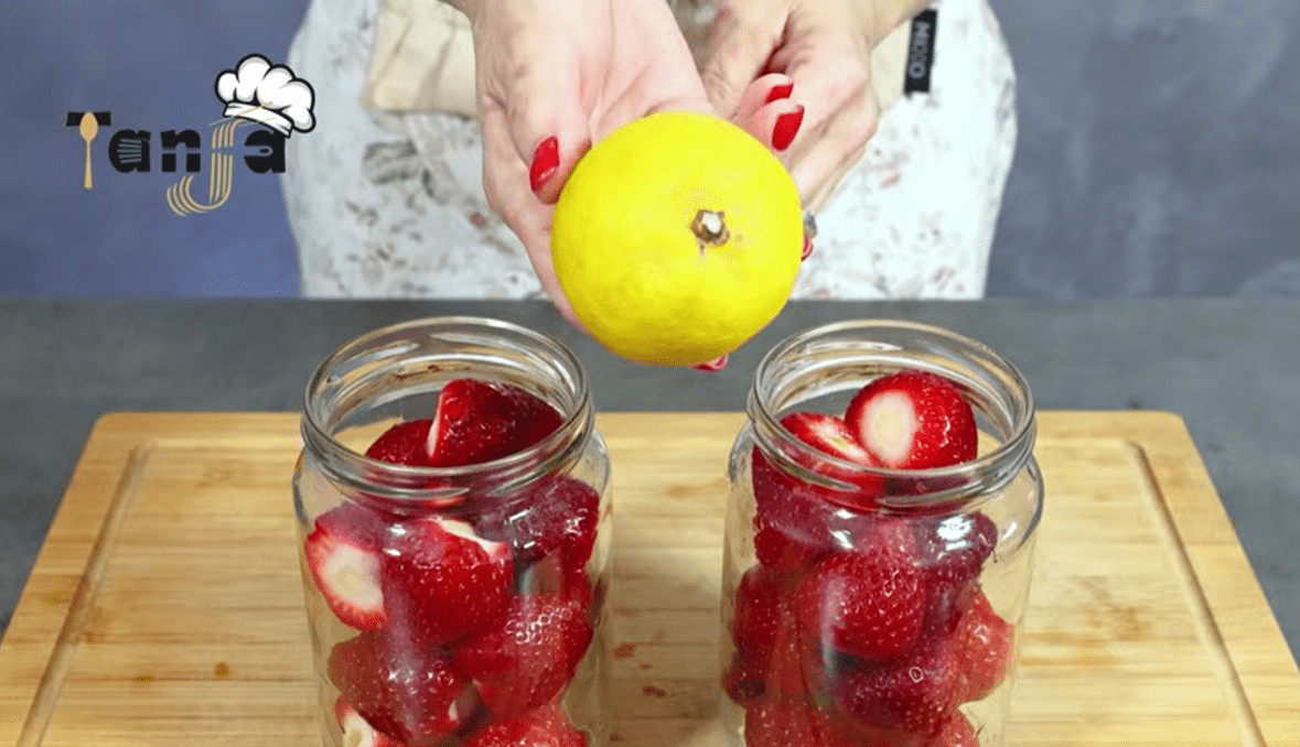 Nakon što ste napunili staklenke, prelijte jagode svježim limunovim sokom. Limunov sok ne samo da poboljšava kiselost i stabilnost jagoda, već i dodaje blagu, osvježavajuću notu. Ova prirodna kiselina pomaže u očuvanju boje i okusa jagoda, čineći ih ukusnijima. Staklenke zatvorite čvrsto i pripremite ih za vodenu kupelj. Ukoliko želite, možete dodati i nekoliko listova mente ili bosiljka za dodatni aromatičan okus.